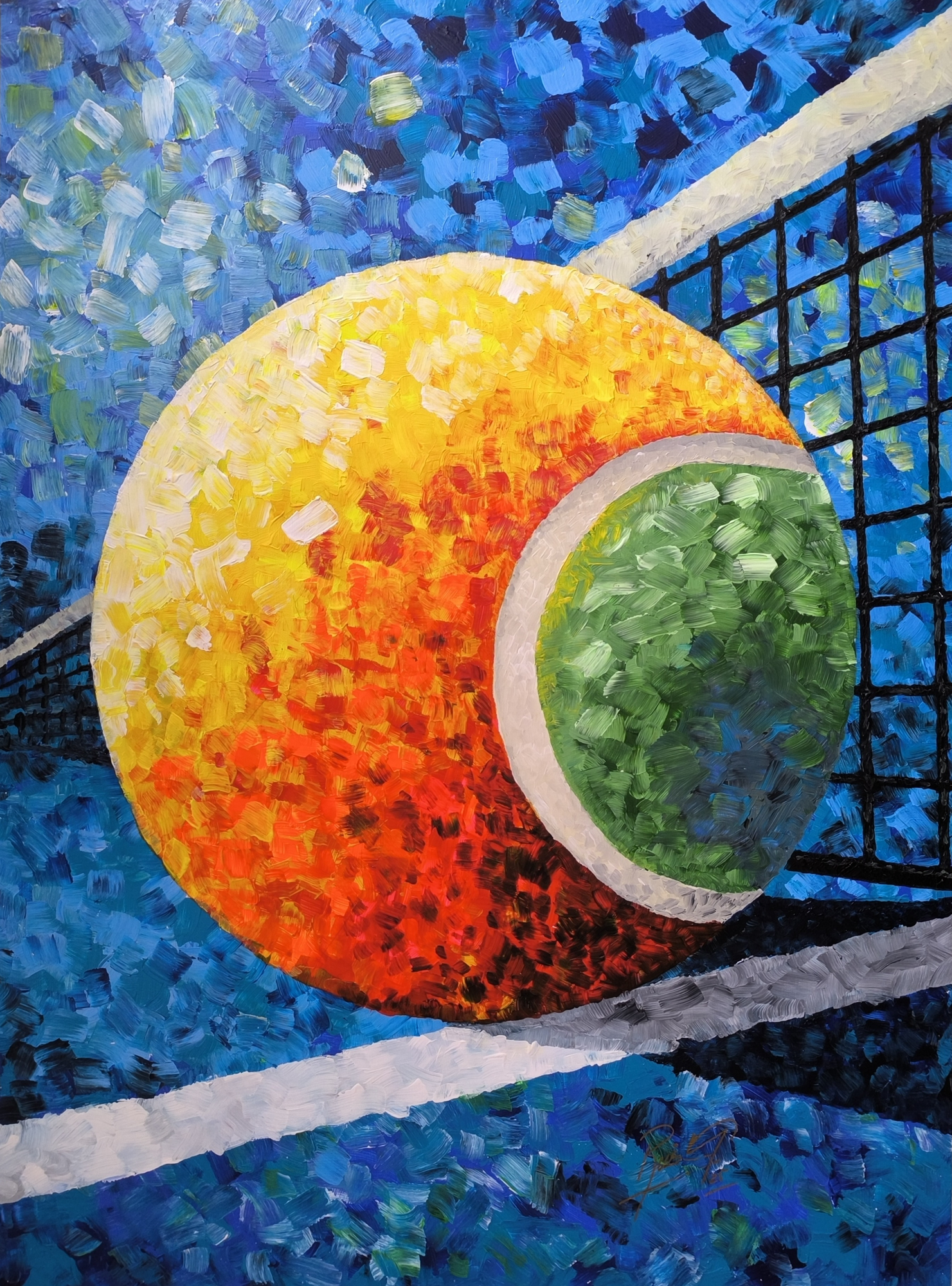 In this acrylic-on-plywood - canvas collection, a tennis ball becomes the center of an explosive burst of color and energy. Bold, impasto strokes radiate outward, capturing a moment where motion is frozen, yet the power is unmistakable. The ball, though immobilized in space, holds the tension of countless rallies, the weight of potential energy ready to ignite in the next instant.