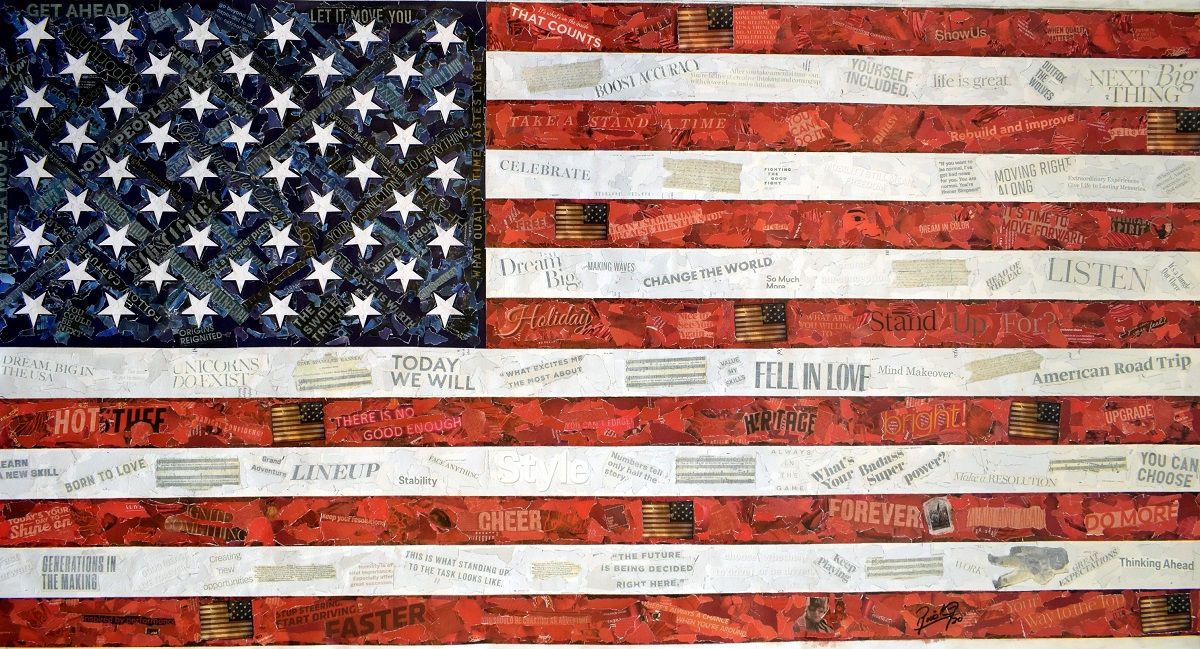 Among the thousands of collages, we find parts of one of the first staves with the music of the historic hymn, a musical notation that symbolizes the harmonious search for a shared American dream. Music, like the flag, unites people of diverse backgrounds and beliefs. It underlines the powerful and uplifting role that art and culture play in shaping the nation.