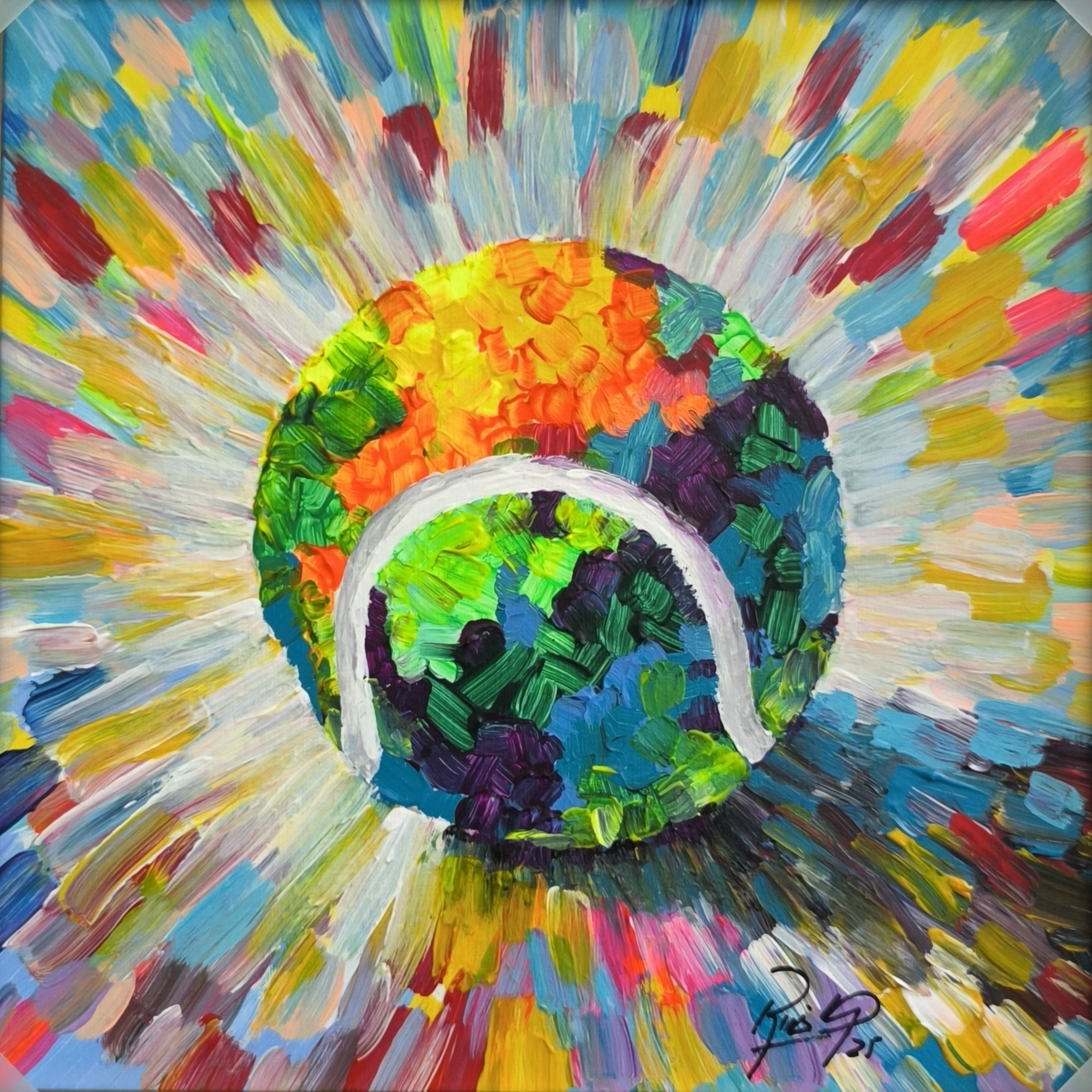In this acrylic-on-plywood - canvas collection, a tennis ball becomes the center of an explosive burst of color and energy. Bold, impasto strokes radiate outward, capturing a moment where motion is frozen, yet the power is unmistakable. The ball, though immobilized in space, holds the tension of countless rallies, the weight of potential energy ready to ignite in the next instant.