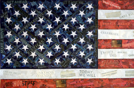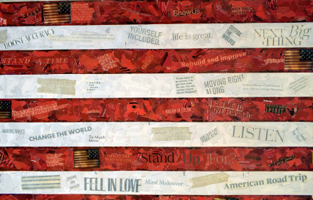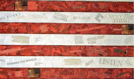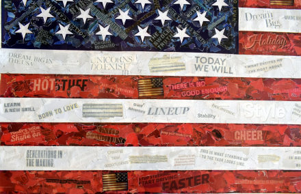 Among the thousands of collages, we find parts of one of the first staves with the music of the historic hymn, a musical notation that symbolizes the harmonious search for a shared American dream. Music, like the flag, unites people of diverse backgrounds and beliefs. It underlines the powerful and uplifting role that art and culture play in shaping the nation.